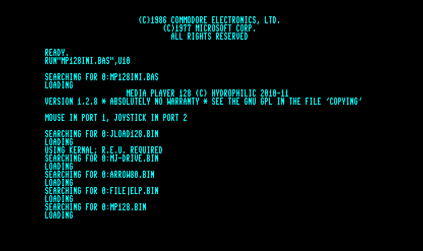This is the second release of an experimental real-time multi-media player for the Commodre 128. Real-time means it can play files directly without waiting to load the entire file into memory (which is quite impossible without some RAM expansion). Multi-media means it will play various formats, some standard, and some I just made up.