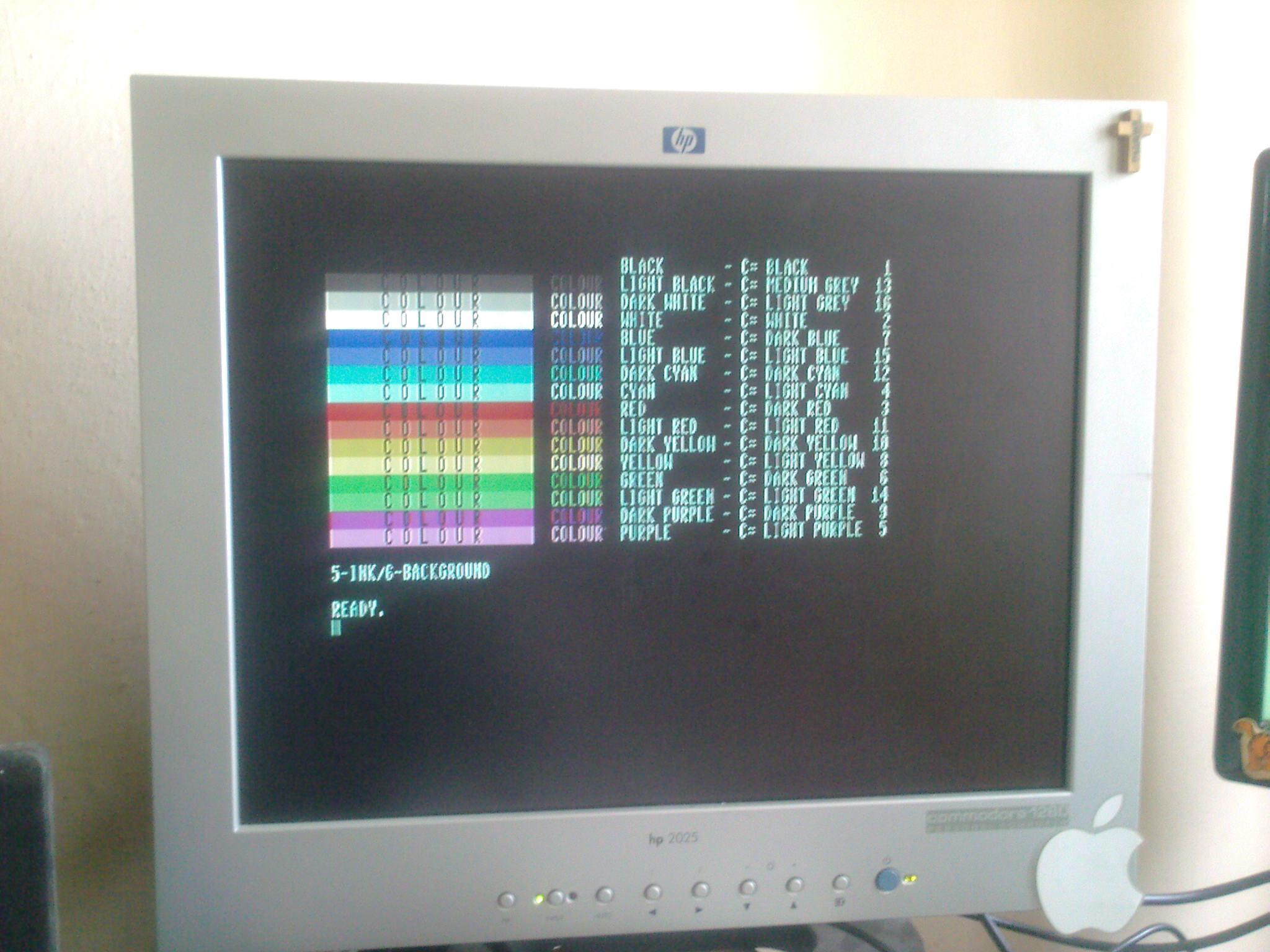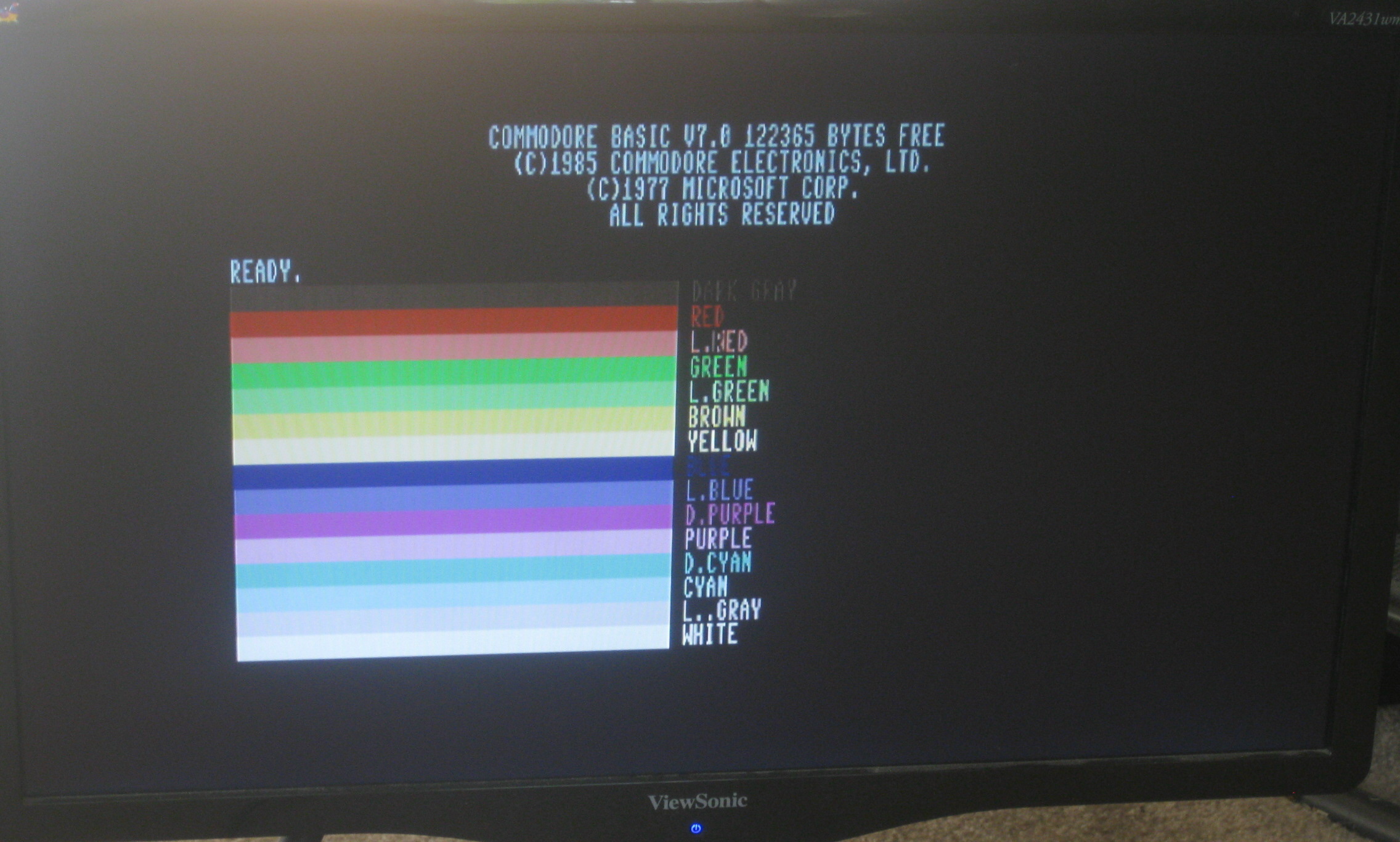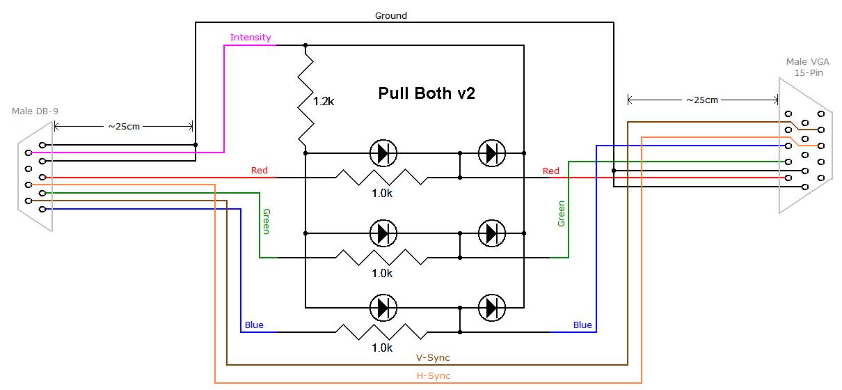 The Commodore 128 features an 80-Column color display using an RGBI output via the 8563, known as the VDC. It offers higher resolution than the 40-Column display of the VIC-IIe (8564 NTSC, 8566 PAL-B often called simply VIC). The VDC also supports video interlacing in hardware. The VIC is easy to connect to common video displays (TVs and monitors) due to various widely-used outputs: Composite, Chroma/Luminance (S-Video), and RF (analog TV antenna). Unfortunately, the RGBI output of the VDC is not compatible with modern equipment. This poses a problem for C128 owners due to the dwindling supply (and expensive shipping) of RGBI and CGA monitors (CGA is very much like RGBI). RGBI is similar to VGA, but uses different voltages and horizontal frequency which most VGA monitors do not like. This page is about a VGA solution (other solutions are S-Video and SCART). The easy way is to use an RGB to VGA adapter, such as one available from Ambery. That particular converter needs a special 9-pin to 15-pin cable. The converter has a 15-pin input, so the cable is needed to use with the 9-pin connector on the Commodore 128. This has been reported to provide acceptable results (both PAL and NTSC) with one major exception: you get only 8 colors!
