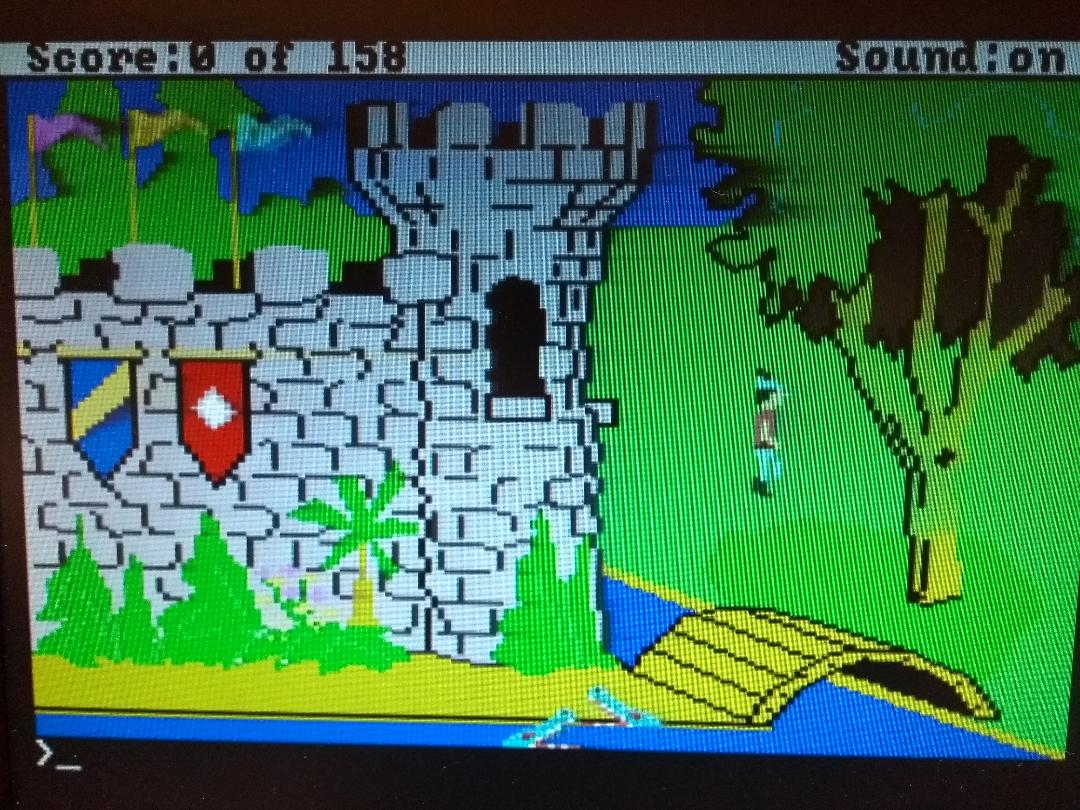 Kyle Kelbert reports that my "Pull Both v2" (at the top of this page) works without any VGA adapter! His computer is a Tandy 1000HX and his monitor is a Daenyx DN-153. Based on his description it sounds like CGA to RGBa conversion. He noted that only a few monitors will work without a VGA adapter (which is why I call this CGA to RGBa). Because a VGA adapter wasn't used, he was able to build my circuit as a small "dongle" board. Kyle also sent an image from King's Quest (CSDb entry / Wikipedia article). Aside from the moiré patterns (caused by the camera) I don't see any obvious problems, but he reports a mild "color bleeding". However, his "dongle" (see above) is using "power" diodes (1N4001) when "switching" diodes (like 1N4148) should be used. Update: Kyle emailed me to say that using "switching" diodes 1N4148 fixed the "color-bleeding" problem! In summary, do NOT expect good results with "power" diodes like 1N4001. See also a similar "CGA" section on my "VGA ultimate" page. © H2Obsession, 2012, 2013, 2014, 2019, 2021 Screen shot of HP Monitor © Miro Karkus, 2013. Used with permission. Images of "dongle" and Tandy game © Kyle Kelbert, 2019. Used with permission. |