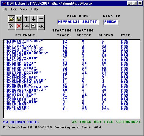 Three fonts are supplied in the download and should be copied to your system fonts folder (Windows/FONTS for Win9x or WINNT/Fonts for WinNT). On WinNT, a font error message appears to me at program start-up even though the fonts are installed and display correctly. I discovered that Windows Vista (and presumably later versions, like Windows 7/8/10) will not allow you to copy the fonts from the download into your WINDOWS/FONTS folder using Windows Explorer. If you copy them using a Command prompt, they will not be listed in the FONTS folder using Windows Explorer. The correct way to install the fonts, on these newer systems, is right-click each font in the unzipped download, and click Install from the context menu. I use it for browsing non-D64 disk images. This was for personal use but I am making it available for others to use or study. It has not been tested for write support although D64 writing may still work ... you have been warned!