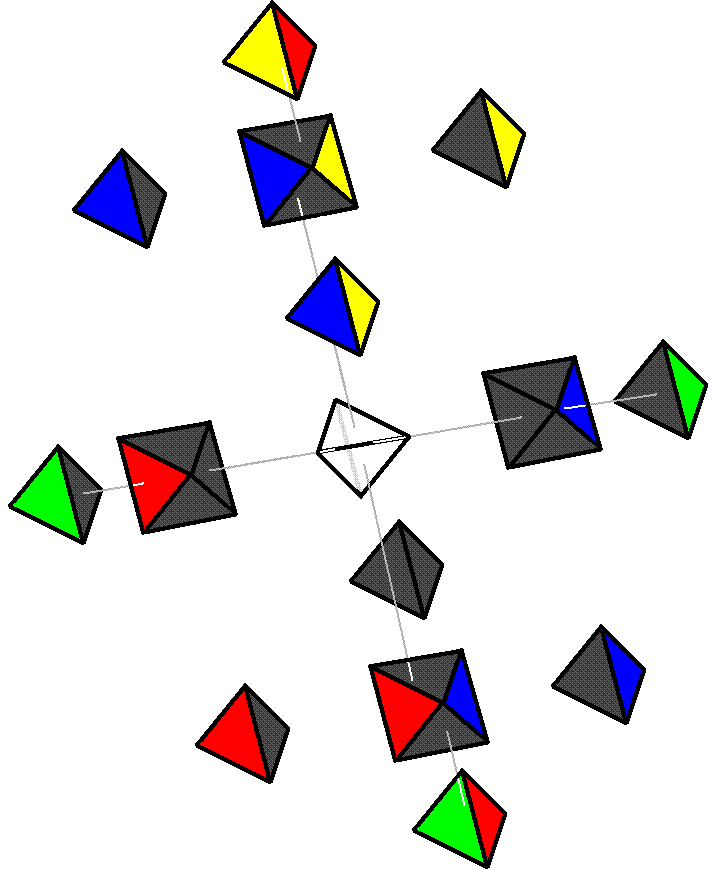 - four (4) tetrahedron "tips", each with 3 visible facets (colored triangles) and 1 hidden facet